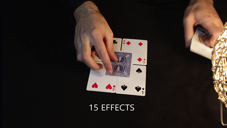 4 in 1: You have your audience freely select four cards and then reveal that they are exactly the four 4's in the deck (spades, hearts, clubs and diamonds). You then take a special card that has a different back and a blank face and place it on top of the four cards. After a few seconds, the card is printed and the four indexes of the 4s appear.