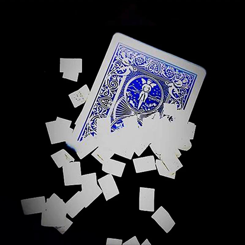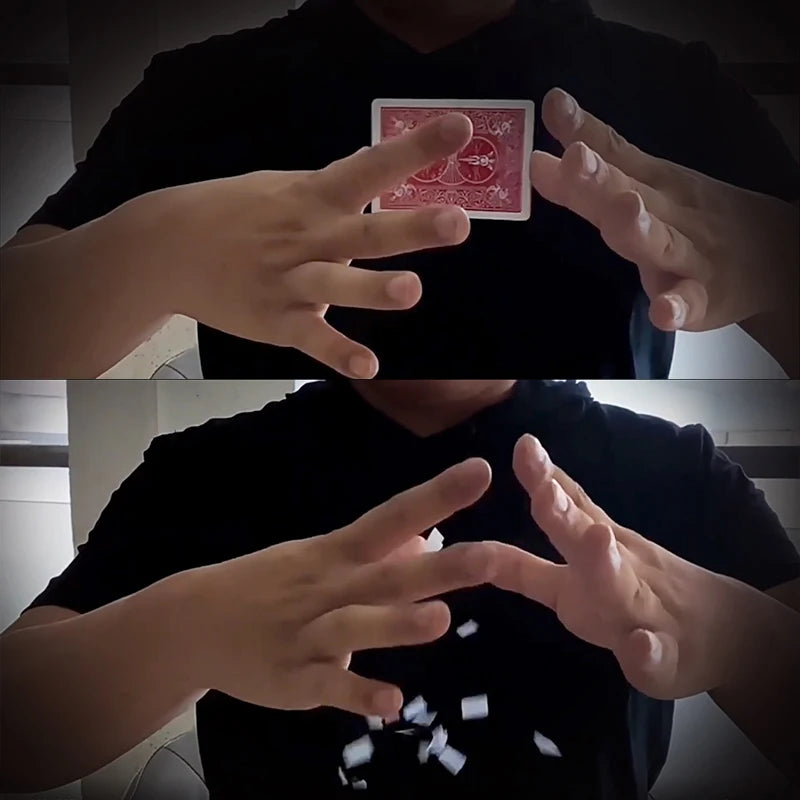Without any cover, a playing card instantly vanishes from the magician's hand and turns into some snowflakes.